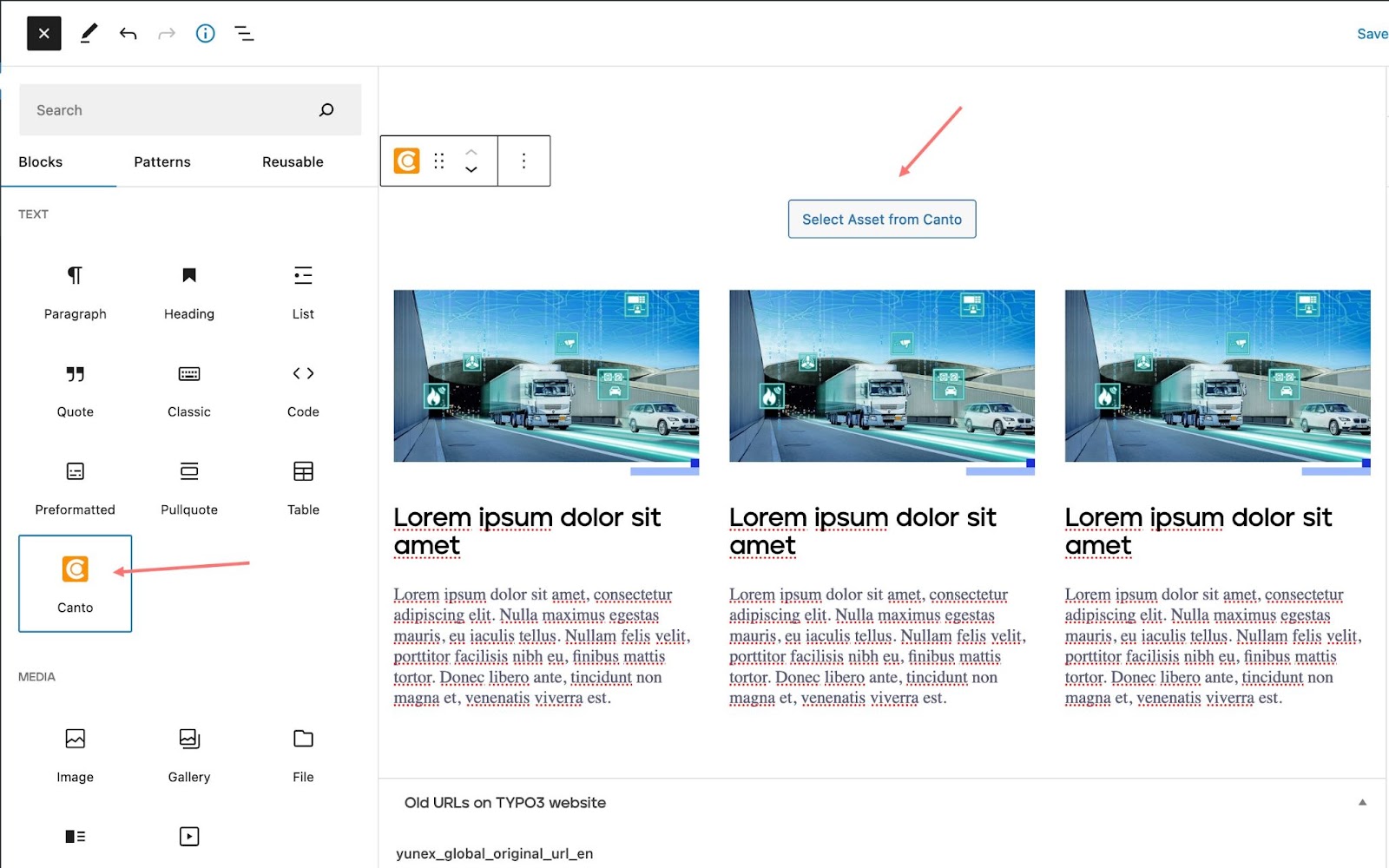 To select assets from the shared Canto Library, there is a special Canto block available. After adding this block to the page, Select asset from Canto button will appear.